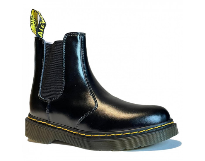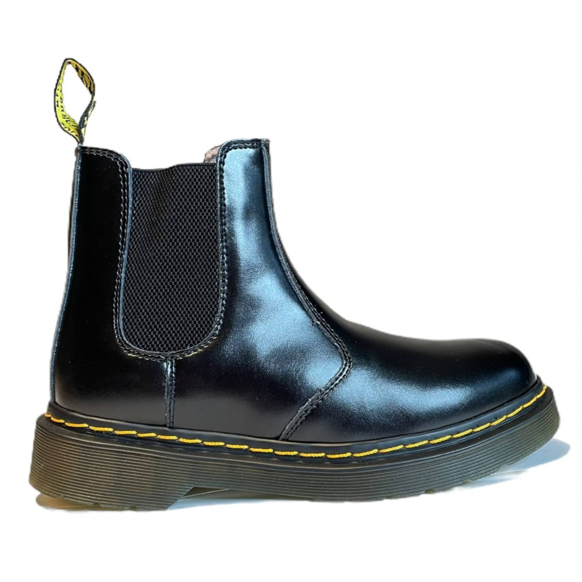 Dr. Martens Chelsea Leonore Чёрные с мехом — низкие ботинки из гладкой чёрной кожи с боковыми эластичными вставками и тёплой меховой подкладкой. Модель сочетает классический силуэт челси с комфортом и защитой в холодное время года.